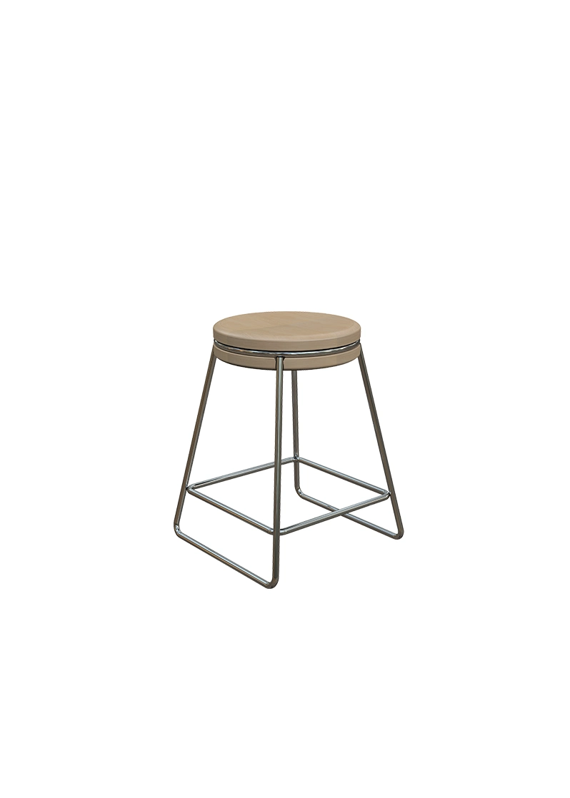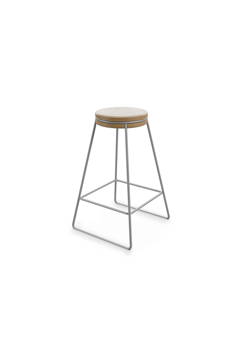Sua estrutura metálica garante resistência, enquanto o assento de madeira proporciona um toque de conforto e naturalidade, adaptando-se com facilidade a diferentes tipos de mobiliário e usos.
