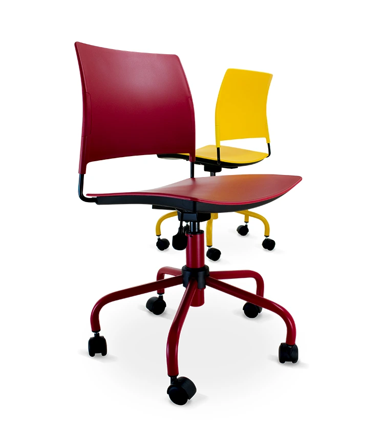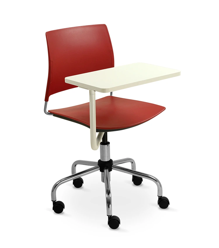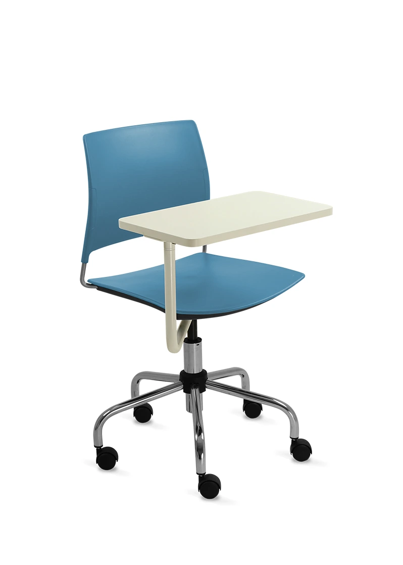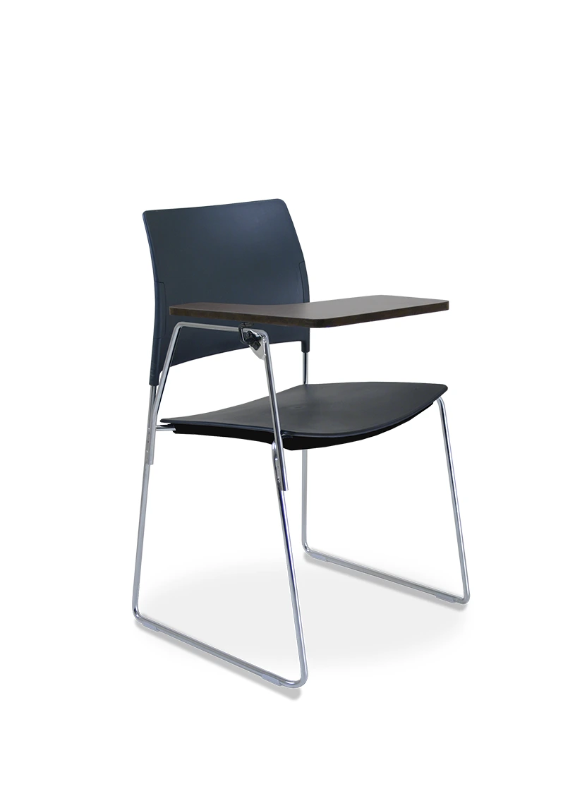 Sua grande vantagem está na modularidade: você pode optar por versões com ou sem estofamento, com braços, pranchetas ou base giratória — e ainda empilhar com facilidade quando não estiver em uso