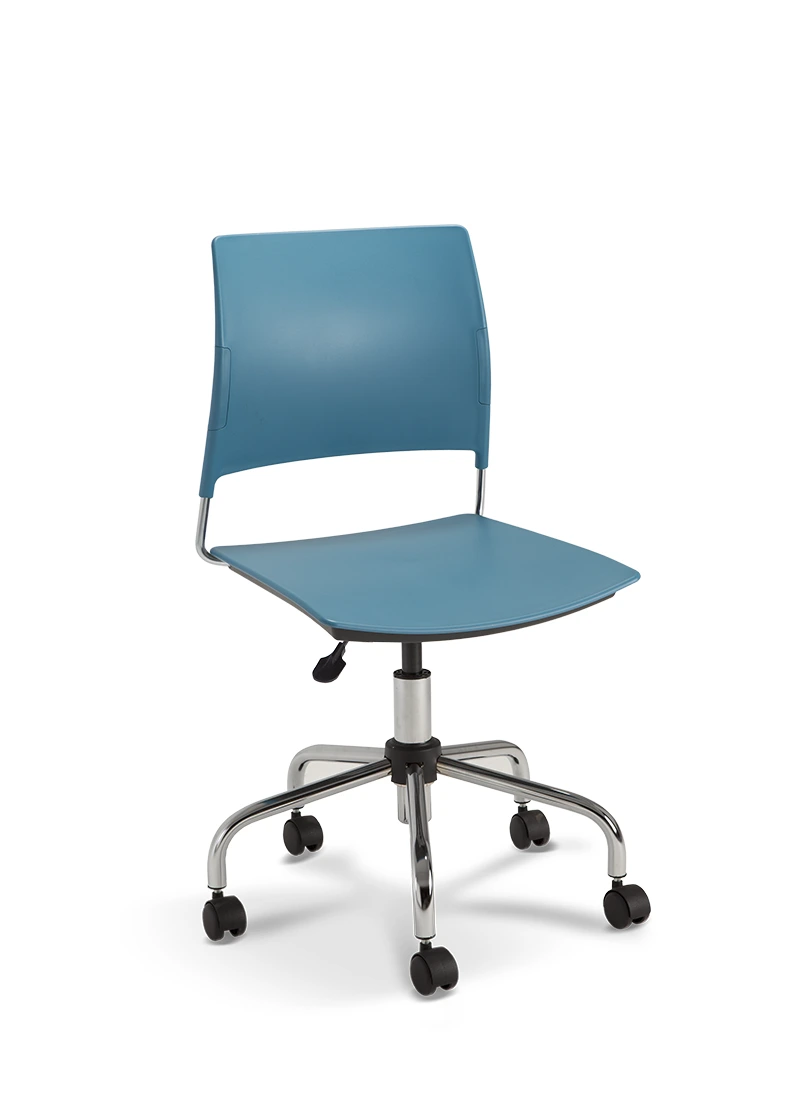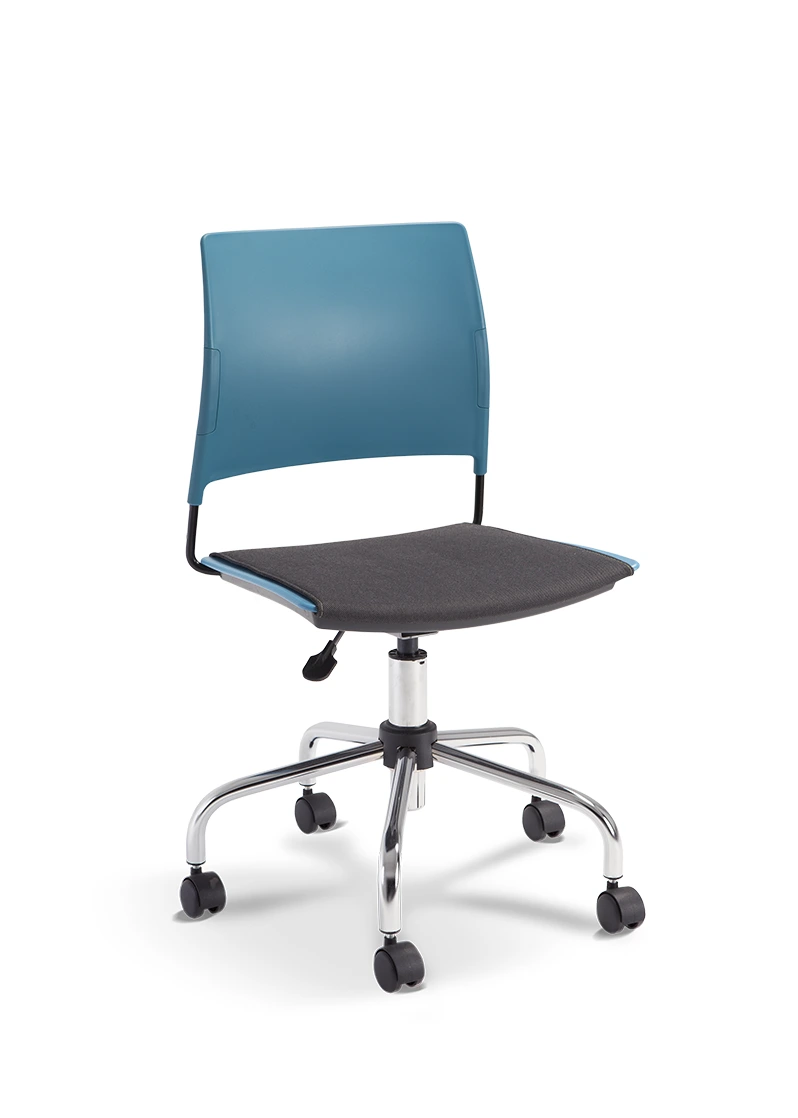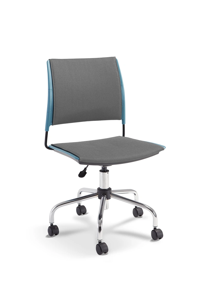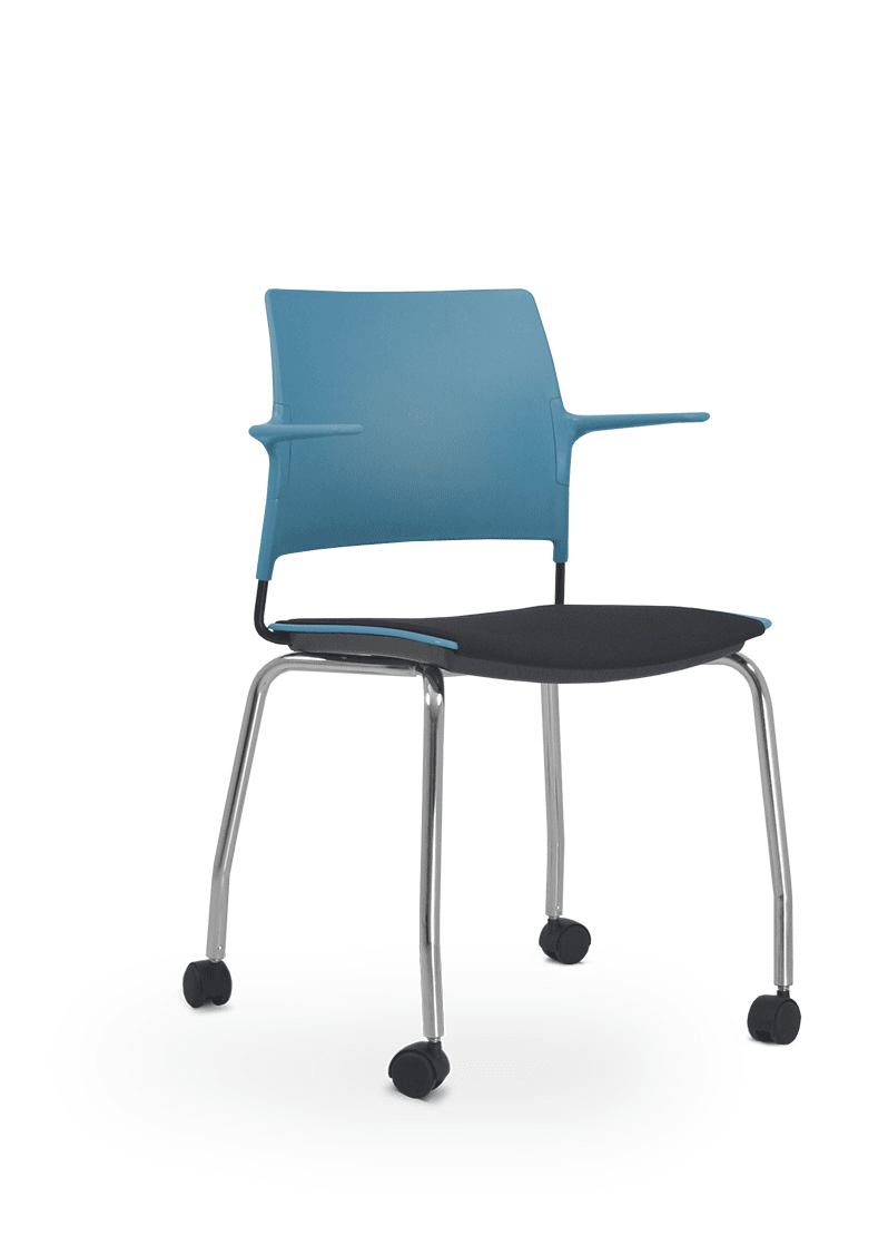Sua grande vantagem está na modularidade: você pode optar por versões com ou sem estofamento, com braços, pranchetas ou base giratória — e ainda empilhar com facilidade quando não estiver em uso