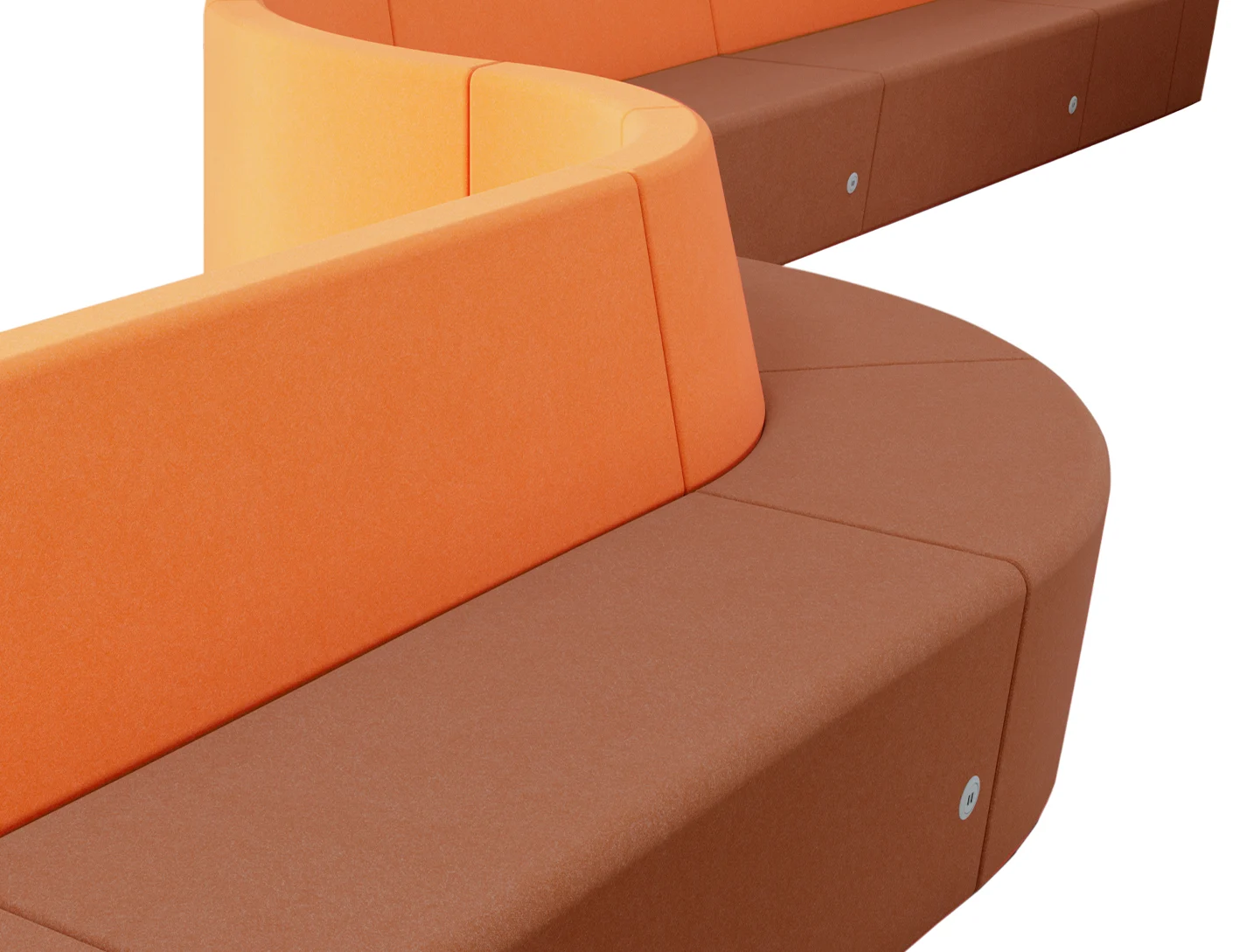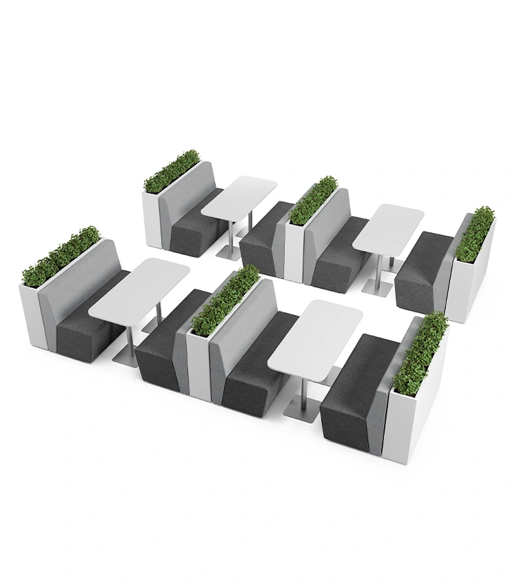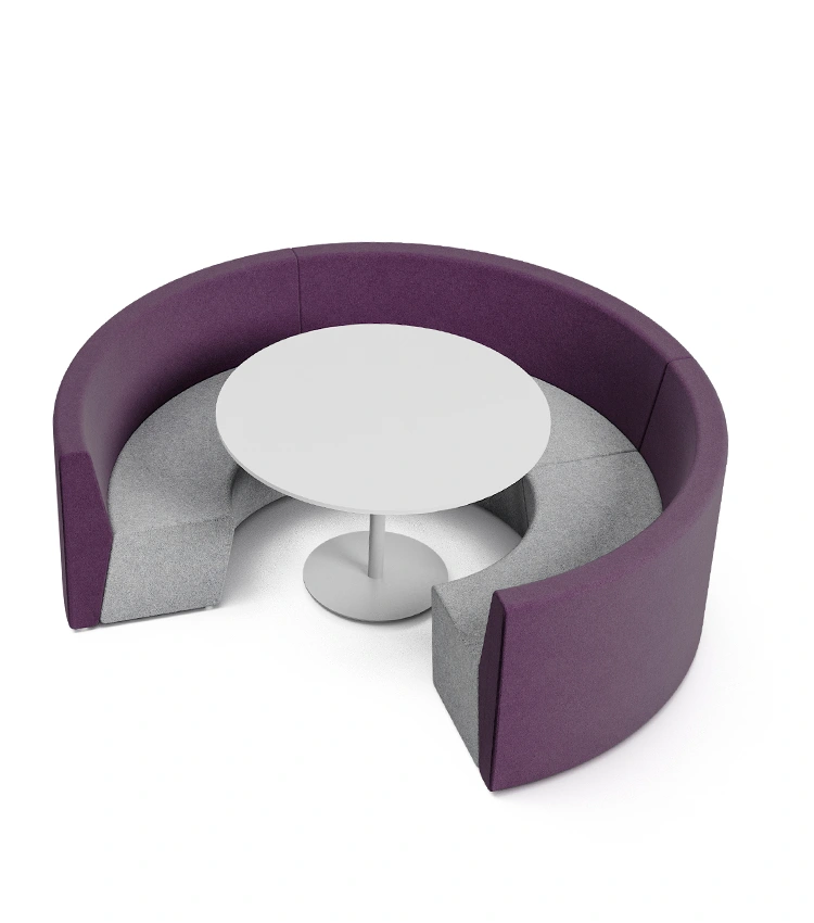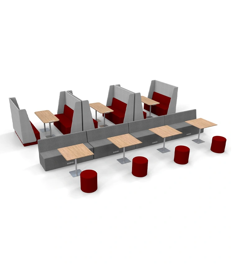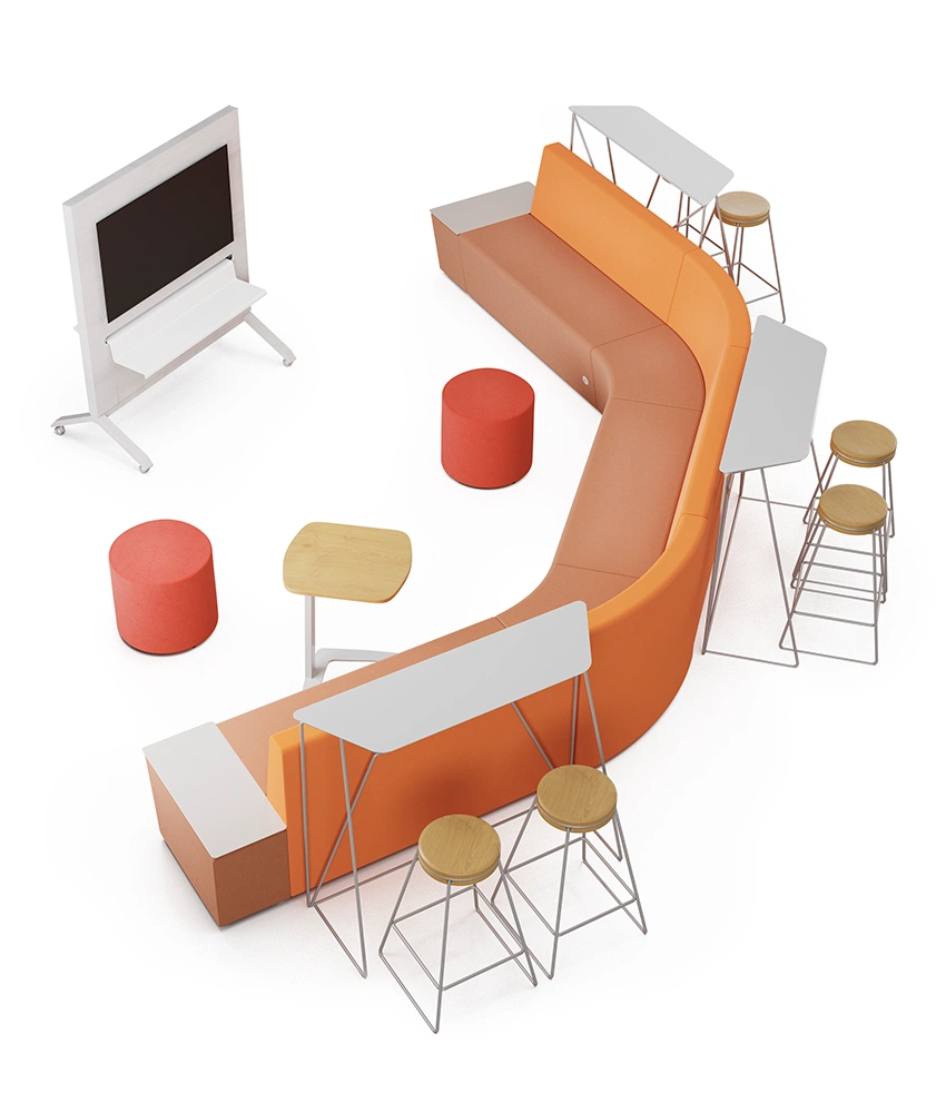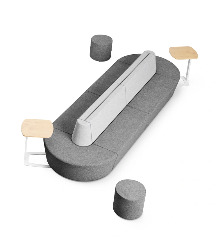 Com módulos retos, curvos, de canto e puffs, é possível organizar desde círculos de conversa até estações individuais. O conforto ergonômico aliado ao visual contemporâneo garante funcionalidade sem abrir mão do design.
